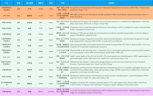 在消化系统肿瘤领域,AG百家乐产品相关研究共入选2项口头报告、11项壁报和1项电子壁报,共14项研究。除卡瑞利珠单抗和阿帕替尼外,还有4篇阿得贝利单抗治疗消化系统肿瘤研究入选。HRS-4642、瑞拉芙普-α注射液(SHR-1701)等在研创新产品也有相应研究亮相。另有1项伊立替康脂质体(II)用于胰腺癌治疗的研究入选壁报。